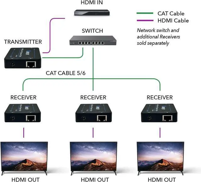 Extended Video Signal: Transmit video signals up to 330 feet (100 meters) at full HD 1080p resolution using Cat5e/Cat6 cables. Supports direct 1-to-1 connections or 1-to-many setups through gigabit network switches. Additional receivers are available separately (Additional