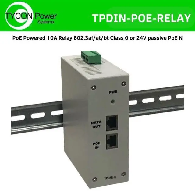 SKU: TPDIN-POE-RELAYThe TPDIN-POE-RELAY is a unique device that provides a way to control up to 10A of current from a managed PoE Switch or other PoE device. When PoE is applied to the TPDIN-POE-RELAY, the relay closes and the LED turns ON. When PoE power is removed, the relay turns off and the LED turns OFF. There are two connections, a normally closed and a normally open, so that both relay logic states can be utilized. Many modern PoE switches allow an operator to enable or disable the PoE on a particular port. This PoE switch function can be used to control the relay. The unit features a Gigabit Data Passthrough with surge protection to protect the data connection up to 30KV. It mounts to a standard DIN Rail commonly used in industrial installations. Features PoE Powered, No Other External Power Required Accepts 802.3 af/at/bt Class 0 PoE or 24V Passive PoE Normally Open and Normally Closed 10A Relay Connections Gigabit Data Passthru with Surge Protection Wide Operating