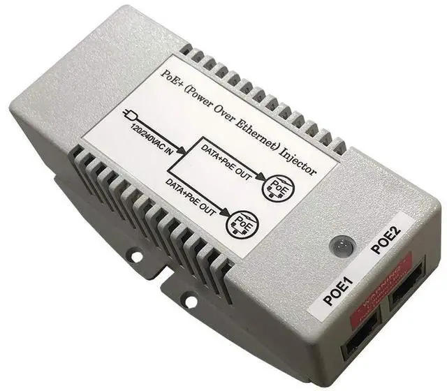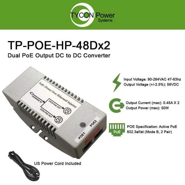 The TP-POE-HP-48DX2 is a unique high power PoE injector with Dual 802.3 af/at compatible outputs. This means that two devices can be powered from a single PoE injector. The data path between the units is handled by the injector so no PoE switch is required. Power Output is 50W total or 25W per port. They have a standard removable power cord input (North American Power Cord Included). They have various protections for short circuit, overload, and surges caused by ESD or lightning. The built-in surge protection protects sensitive connected devices from damage due to surges on data and PoE lines.
