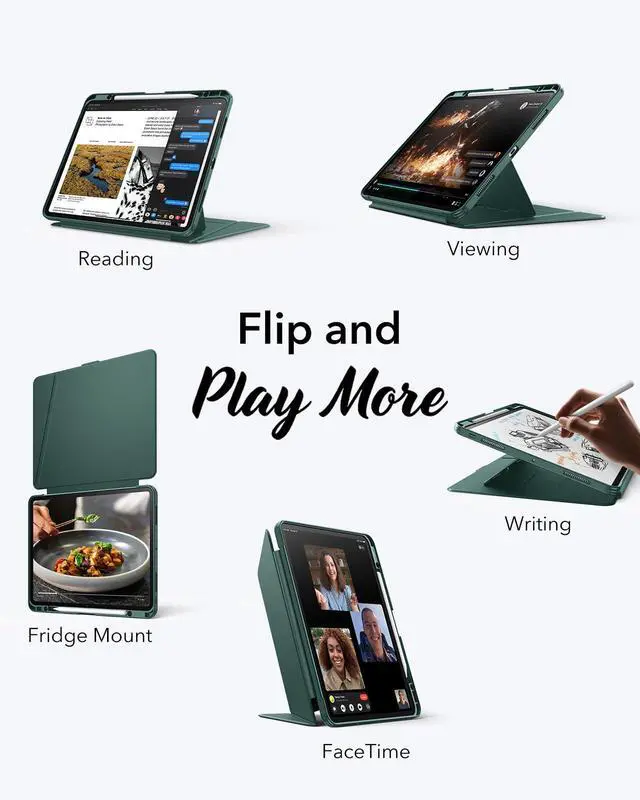 Flip and Play More: the three magnetic grooves allow you to adjust the device's angle from 25° to 60° in landscape mode, making it perfect for reading, watching movies, and writing; it can also be used in portrait mode with a stable support, which is ideal for browsing the internet and making FaceTime calls; additionally, you can attach it to magnetic surfaces like refrigerators, for added convenience in various situations