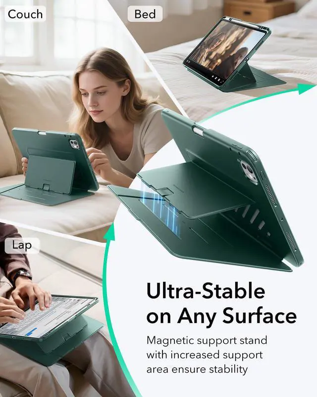 Ultra-Stable Stand: designed with a wide cover and strong magnetic bracket, this case remains stable on any surface, whether on a desk, sofa, bed, or even