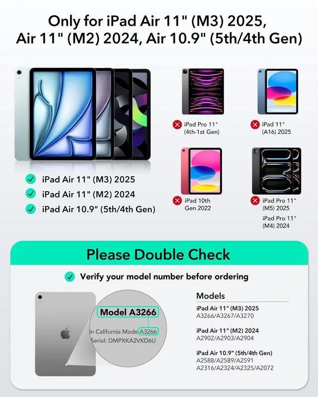 Compatibility: only for iPad Air 11" (M3/M2) 2025/2024, iPad Air 10.9" (5th/4th Gen) 2022/2020;