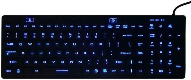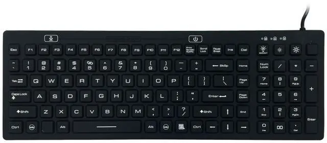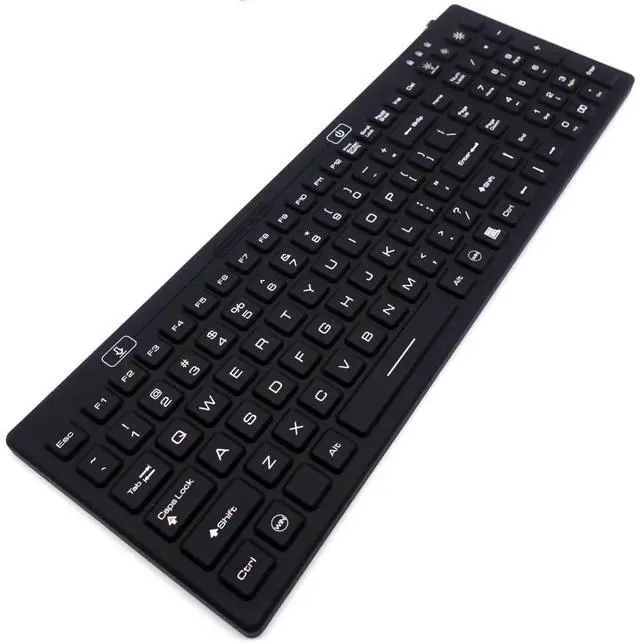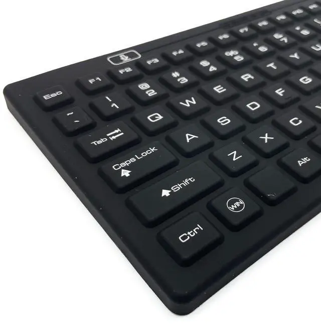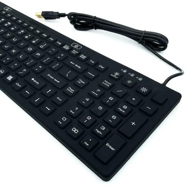 DSI Waterproof IP68 Silicone Full Size Keyboard with LED Backlit. IP68 keyboard made of rigid and rugged silicone, rubberized surface makes typing more comfortable. Blue backlight 2-step adjustable brightness of the backlight. Soap water washable