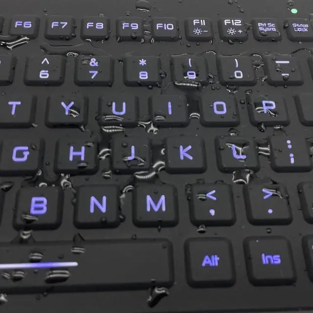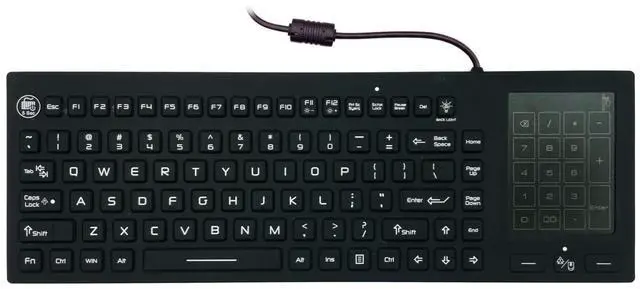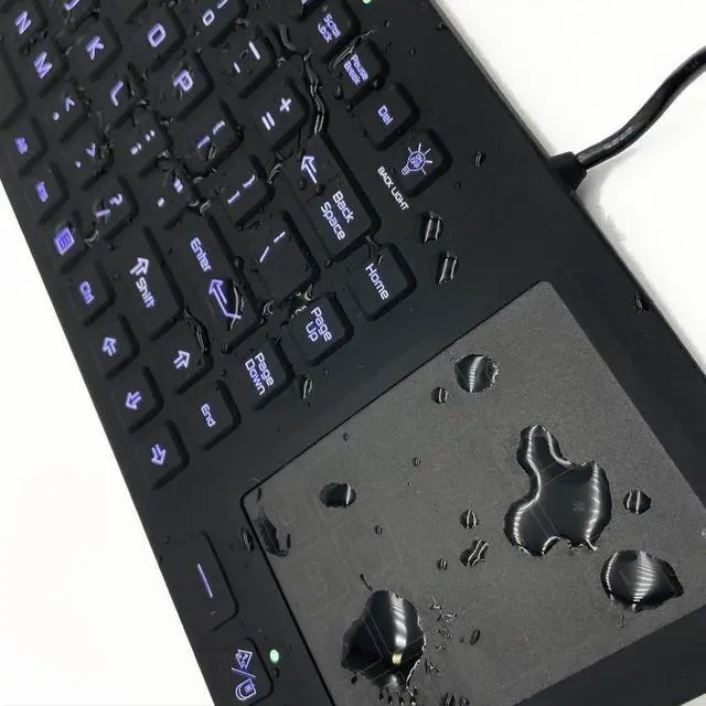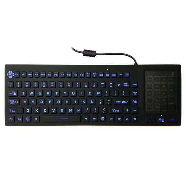 This updated waterproof keyboard meets safety standards and is ideal for use in medical and industrial environments. It features adjustable backlighting and a built-in multi-touch trackpad to switch to a number pad when needed. It provides a quiet and comfortable typing experience and is rugged and washable, making it suitable for medical applications and industrial settings. Additionally, it is made of certified disinfectant silicone. It complies with FCC, RoHS, and CE safety standards and is IP68 rated for water and dust resistance.