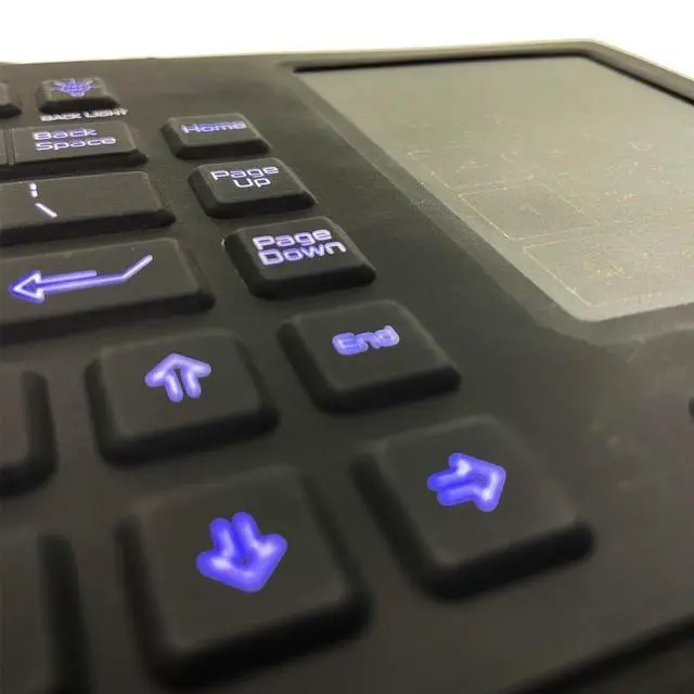 Layout: US 88 keys including 12 function keys, 2-in-1 multi-touch trackpad and numberpad, "5 Sec" key disabling key, backlight adjustable and disabling keys