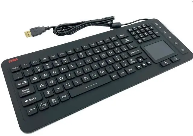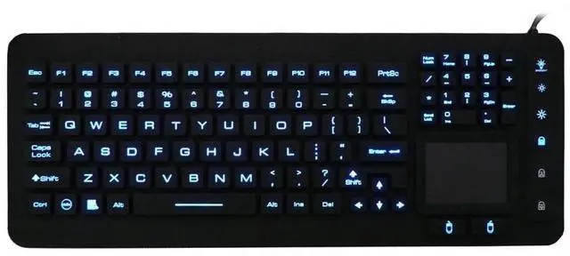 This updated waterproof keyboard meets safety standards and is ideal for use in medical and industrial environments. It features LED lighting with a light guide panel, ensuring uniform backlighting for each key. The keyboard includes adjustable backlighting, a built-in touchpad, and function keys from F1 to F12. It provides a quiet and comfortable typing experience and is rugged and washable, making it suitable for medical applications and industrial settings. Additionally, it is made of certified disinfectant silicone. Complies with FCC, RoHS, and CE safety standards and IP68 rated for water and dust resistance.