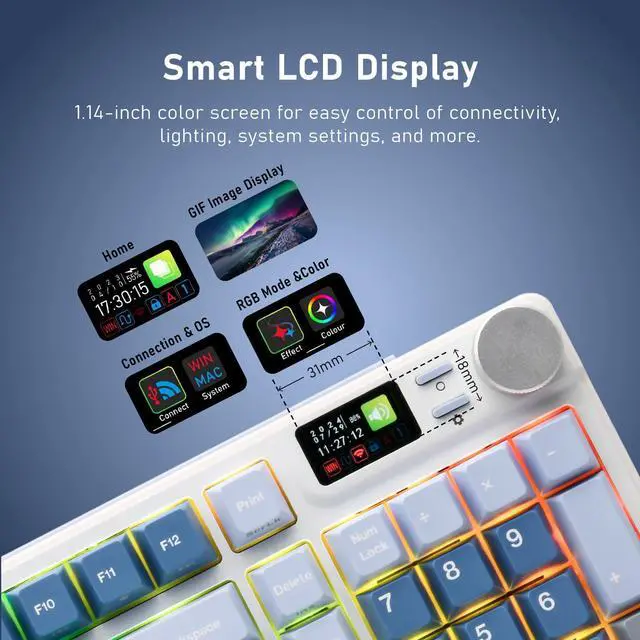 iRocks K85R Wireless RGB Backlit Mechanical Gaming Keyboard with LCD Display, Hot-Swappable Pre-lubed Switches, 98 PBT Keys, USB-C Detachable Cable (Aurora Blue, Silent Bubble Switch)