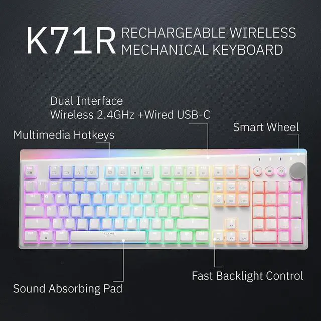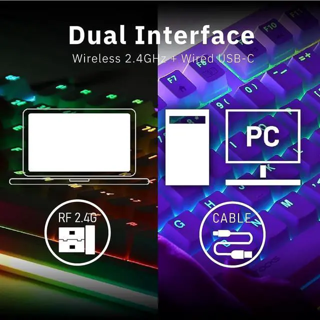 Dual InterfaceWireless 2.4GH z + Wired USB-C, Using a low latency 2.4GH z connection, gamers can enjoy a cable-free gaming experience. Simply switch to wired mode with a single pull to charge and type simultaneously. It's a versatile choice for gamers ^^ PBT KeycapsHigh-quality Mechanical Gaming Keyboard is designed with PBT keycaps outlive ordinary ABS ones with it comes to surface wearing. The keycaps are made with doubleshot (dual-injection) technology to prevent backlit legends from fading ^^ RGB switchesDeliver up to 50M click lifespan. Powered by an advanced microcontroller, it features N-key rollover and anti-ghosting for smooth and precise gaming or fast typing.