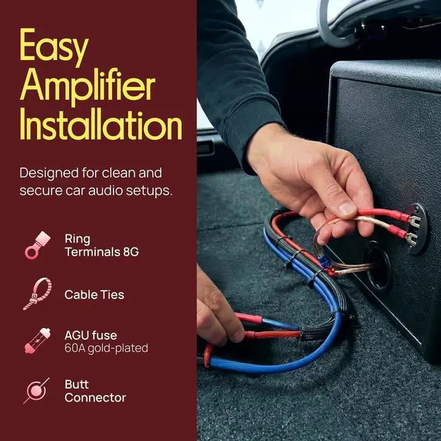 Included wires: 20 ft. 8-gauge red power wire, 4 ft. 8 gauge black ground wire, 20 ft. 18-gauge blue remote turn-on, 20 f. 12 gauge stereo speaker wire, 20 ft. stereo RCA cable, and 6 ft. black split loom cable conduit. Also includes an AGU type 60A gold-plated fuse, water resistant in-line fuse holder, two 8G ring terminals, two 8G spade terminals, five 14-16G spade terminals, 3 butt connectors, 20 cable ties, and one black grommet. Marine Grade Cables and Wires Perfect for Installations in Boats and Outdoor High Resistance to Moisture 20ft. 8 Gauge Red Power Wire 4ft. 8 Gauge Black ground Wire 20ft. 18 Gauge Blue Remote Turn-On 20ft. 12 Gauge StereoSpeaker Wire 20ft. Right Angle/Standard Stereo RCA Audio Cable 6ft. Black Split Loom Cable Conduit AGU Type 60A Gold Plated Fuse Water Resistant In-line Fuse Holder 2