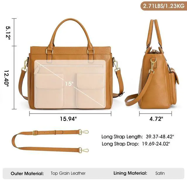 FITS 15 INCHES LAPTOP: Briefcase for women pocket with padded compartment (can fit 15" laptop), this spacious leather work bag measures 15.94" x 12.4" x 4.72" and 2.97lbs, large capacity enough to store books, folders, documents, clothes,wallet etc
