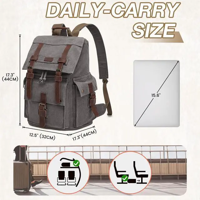 ^^ LARGE CAPACITY: This canvas backpack for men is perfect for those who need to carry a lot of items on a daily basis. Its large capacity provides ample space for storing portable textbooks, A4 magazines, and other essentials. The interior includes a roomy 15-inch main pocket, as well as a pocket that can fit a 17-inch laptop ^^