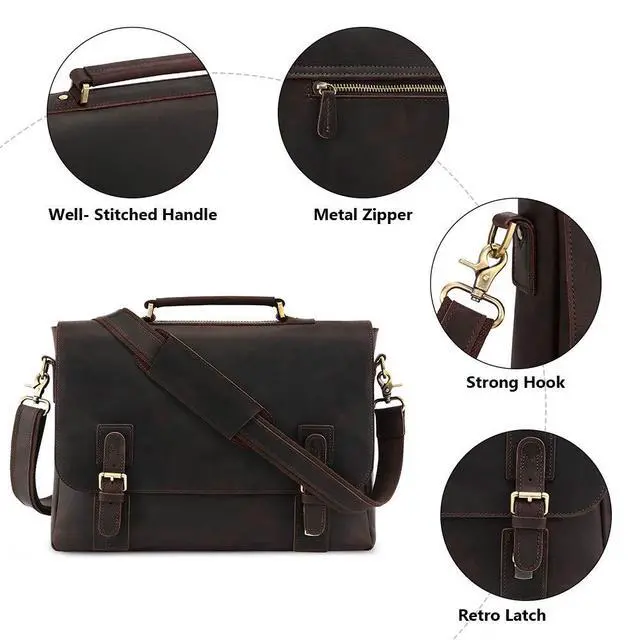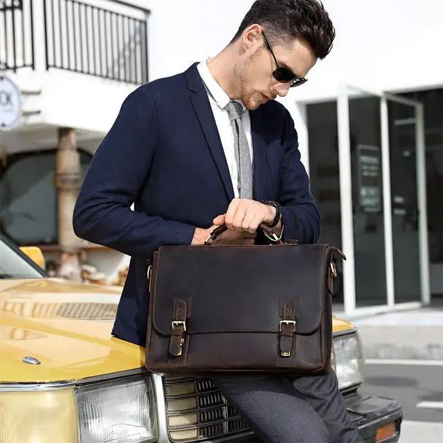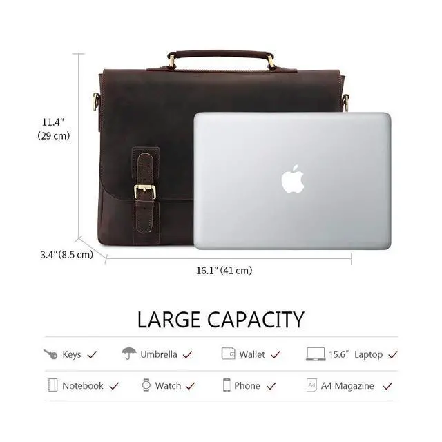 DescriptionKattee Men's Leather Business Bag: Vintage Design, Multiple Uses! A successful man usually needs a nice briefcase which can be used in office, meeting, business traveling or daily life, this is just the one! Vintage Crazy Horse leather and special twin buckle decoration freshen up this Kattee leather satchel handbag. Designed with top handles and adjustable shoulder strap, you could use it as a handbag, shoulder bag or cross-body bag.