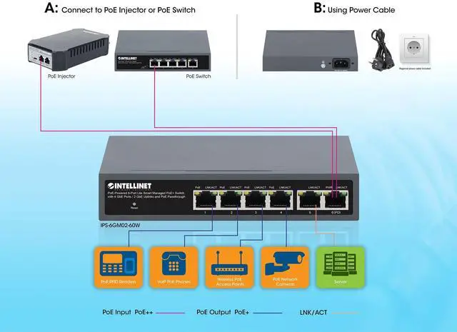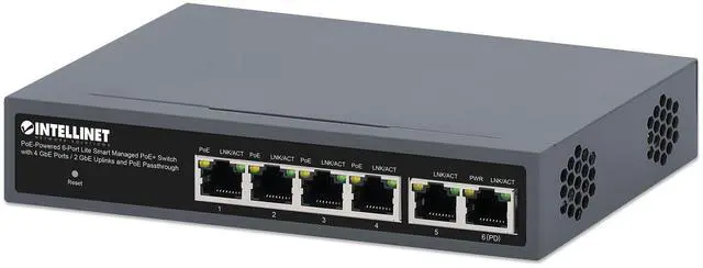 The PoE-Powered 6-Port Lite Smart Managed PoE+ Switch with 4 GbE Ports / 2 GbE Uplinks and PoE Passthrough from Intellinet Network Solutions is designed to take power from a PoE switch or injector and pass both data and electrical power to a number of PoE-compatible devices via standard Cat5e or Cat6 network cables. Equipped with six Gigabit Ethernet ports, this switch can power up to four wireless LAN access points and bridges, VoIP phones or IP video cameras, draw its own power from the PoE switch it is connected to, and deliver network speeds up to 1, 000 Mbps.