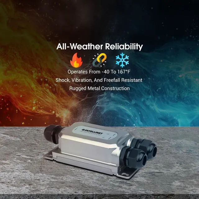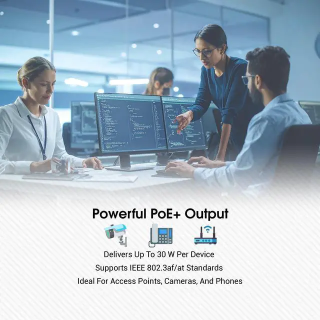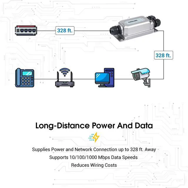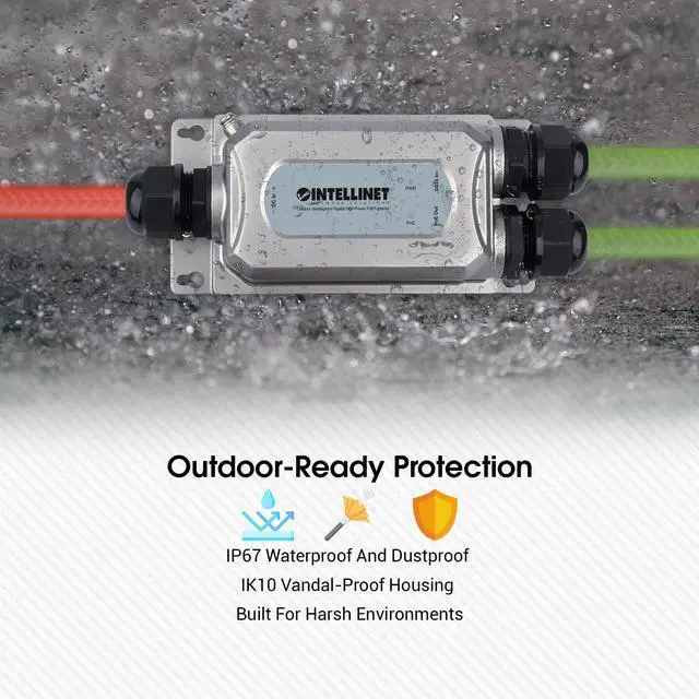 Power over Ethernet with output up to 30 watts. Saves time and money by delivering data and power via existing network cables ^^ IP67-rated, dustproof and waterproof & IK10-rated, vandal-proof. Suitable for extreme operating temperatures of -40 to 75C (-40 to 167F) ^^ Compatible with IEEE 802.3 at/af-compliant powered devices (PD) such as network cameras, wireless access points, VoIP phones and more ^^ Plug-and-play installation; no configuration required. Supports 10/100/1000 Mbps data rates.