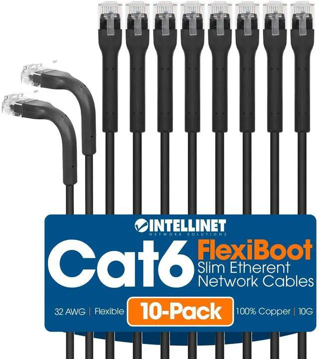Intellinet FlexiBoot Slim Cat6 Ethernet Network Patch Cable 10-Pack - 10Gbps & 250MHz, Flexible Bendable Boot, 32AWG Pure Bare Copper Wire, Gold-Plated Contacts - 5ft, Black