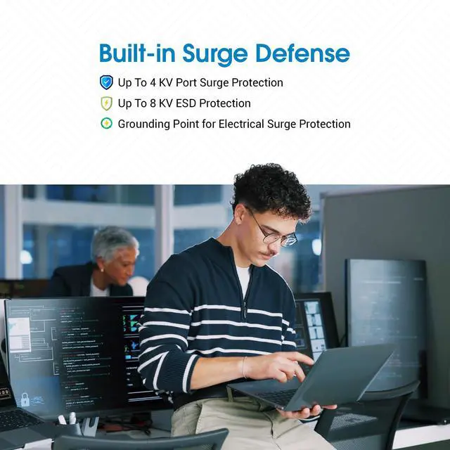 ^^ PROTECTION & SAFETY: auto-sensing PoE awareness only sends power to IEEE 802.3 bt/at/af-compliant devices, non-PoE devices only receive data; grounding point to protect equipment from external electrical surges; ESD protection up to 8 kV (air) and 6 kV (contact); port surge protection up to 4 kV; Short-circuit, overload and high-voltage protection. Fully NDAA-compliant. LEDs for Max PoE (to indicate PoE usage is at or above 80%), PoE, and Power for status at a glance.