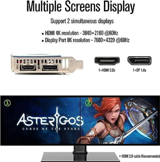 Built on the 14 nm process, paired 2, 048 MB GDDR5 memory, connected using a 64-bit memory interface, this 2 monitor dispaly video card is operating at a frequency of 1228 MHz, which can be boosted up to 1468 MHz, the Geforce GT 1030 card supports DirectX 12, all modern games will run on it. Also featuring low profile design, fits well in the SFF (small form factor) PC cases.