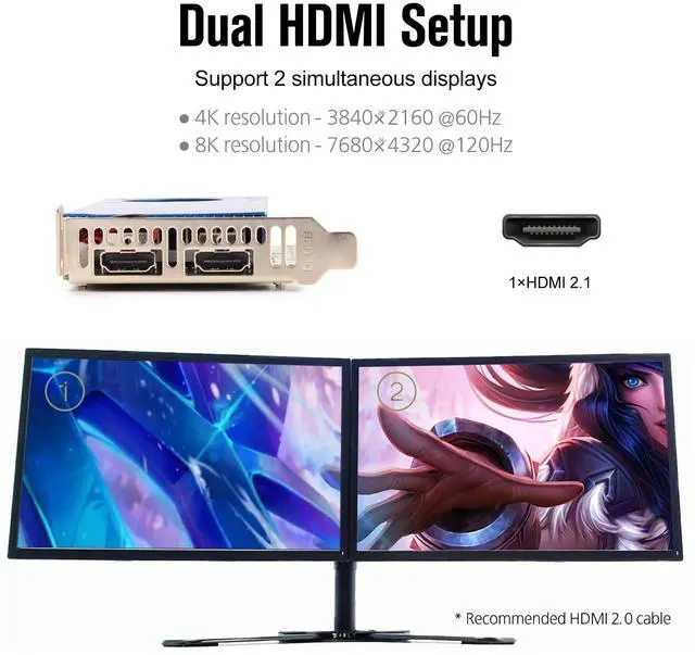 ^^ Dual HDMI Display: With 2 HDMI 2.1 outputs, easy to buid a dual monitor setup stimulateously with landscap or portrait view, boosting your productivity, enhancing multitasking, reducing the need to switch back and forth between tabs or windows.