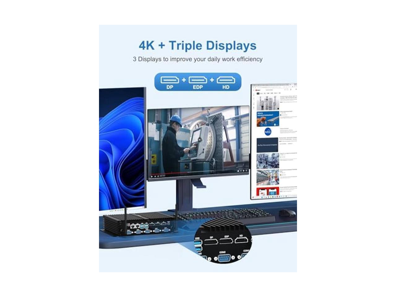 - [(DP / EDP / HD Triple Displays)] This fanless mini pc can connect to three monitors via DP, EDP, HD, supports 3 simultaneous displays, can be used as a PC or HTPC to connect to a home theater, 4K Ultra-high-definition video playback, meet all the needs of office games and drama viewing, say goodbye to multiple small Win, and improve work efficiency by half.