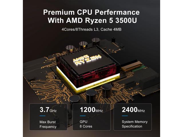 - [(AMD Ryzen R5-3500U Mini PC)] The third-generation AMD Ryzen 3500U Mini PC features 4 cores, 4 threads, and 4MB cache, with a maximum frequency of up to 3.7GHz. It offers better performance compared to CPUs like N100, N95, and N97.Suitable for daily tasks, home entertainment, and business office use, it is more lightweight and convenient than traditional desktop computers.