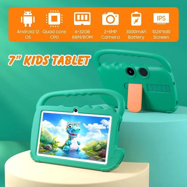 [(4GB +32GB Performance Kids Tablet)] Tablet adopt 4GB RAM, 32GB ROM, Android 12 system. Large capacity RAM and new System, ensures the fast speed when open apps and multi task. 1024x600 IPS display, Wifi, Bluetooth, front 2.0 + back 5.0MP HD Camera. Dual Speaker, 3.5 mm headphone jack. Pre installed kids apps, Specially designed for different age kids.