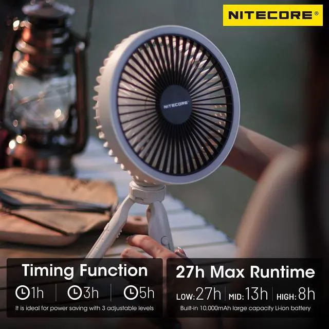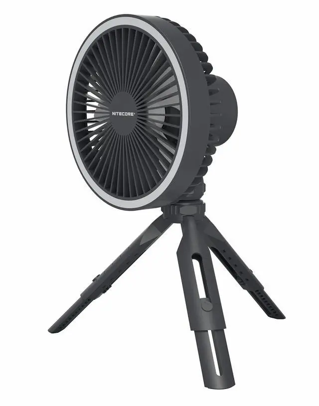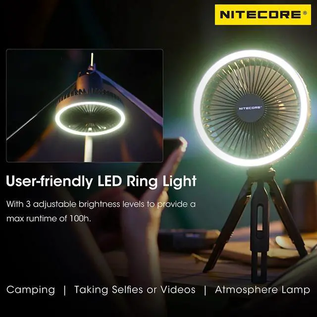 With a brushless motor, the NITECORE NEF10 Multifunctional Electric Fan has a minimal noise. Equipped the built-in 10, 000mAh large capacity Li-ion battery, it can provide a max runtime of 27h. It only takes 4.5 h to fully charge the NEF10. 5-length adjustable legs can be tilted to the desired angle, making the NEF10 suitable for various terrains. The LED Ring Light has 3 brightness levels to adjust with a max runtime of 100h. ^^ 360