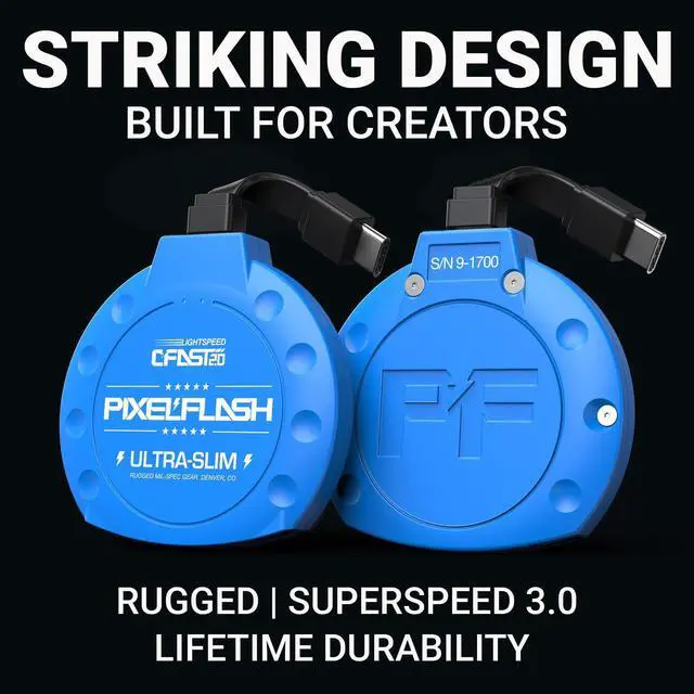 USB-C CABLE: Available in Blue, White, Black, and Red, this compact, travel-ready CFast reader features a permanently attached 2-inch USB 3.1 Type-C cable, ensuring modern connectivity with Thunderbolt 3 and high-speed workstations. The bright blue LED indicator confirms USB 3.1 sync and blinks during transfers for real-time feedback.