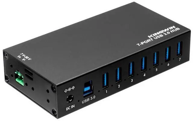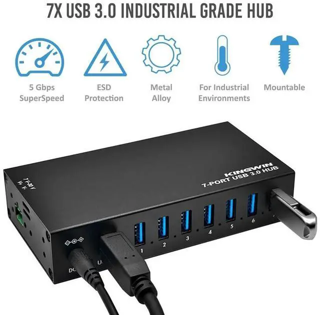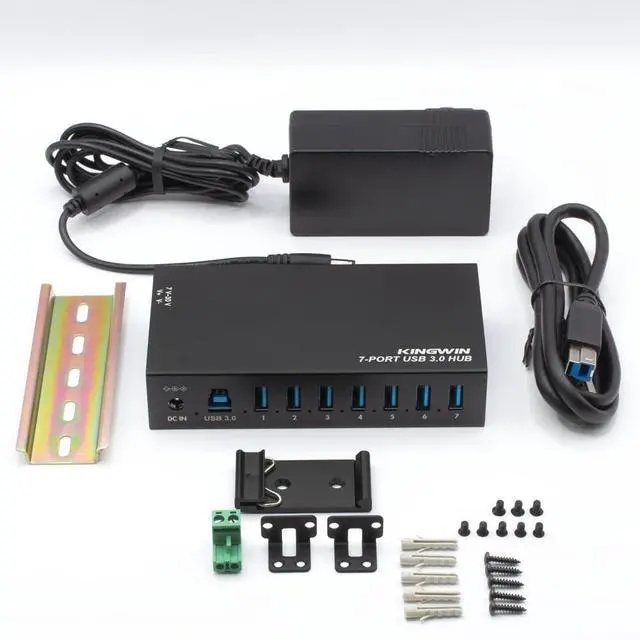 Upgrade your workstation with the Kingwin USB 3.0 Hub 7 Ports, a high-performance industrial-grade metal USB hub designed for reliable, stable, and fast connectivity. Whether you're expanding ports for a PC, laptop, POS system, industrial machine, server rack, or production line, this mountable USB hub delivers the durability and speed professionals depend on. Built with heavy-duty aluminum housing, this hub withstands demanding environments including warehouses, manufacturing facilities, and commercial workspaces. Its mountable design allows secure installation on walls, under desks, equipment racks, or workstations, keeping cables neatly organized and preventing accidental movementperfect for clean setups and permanent installations.
