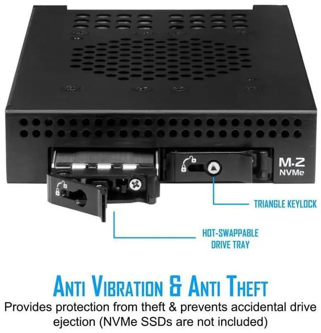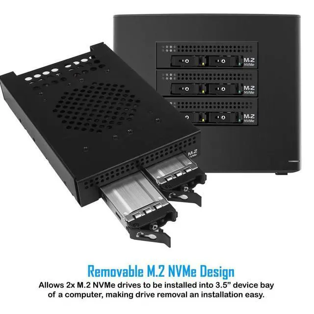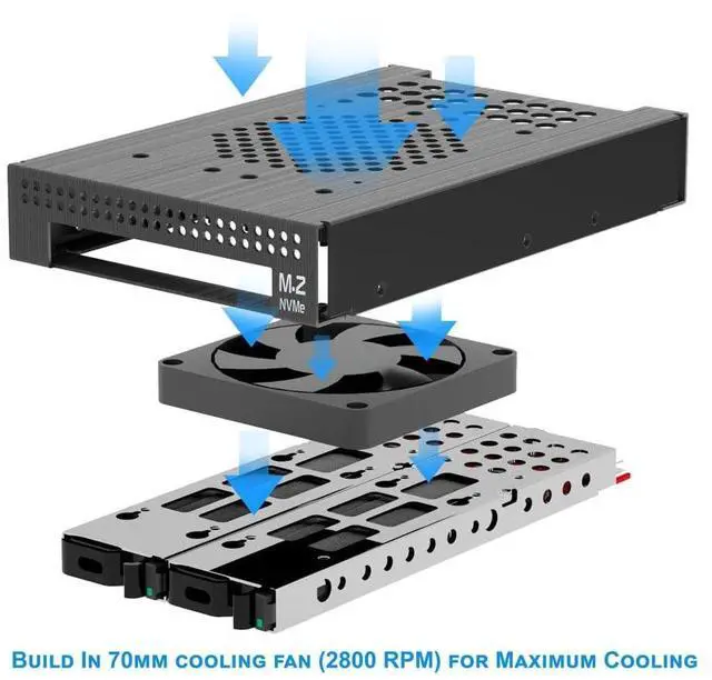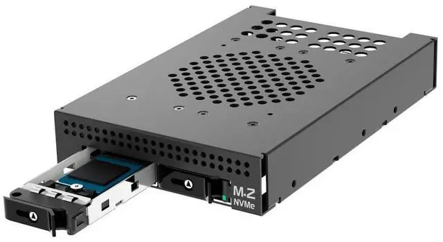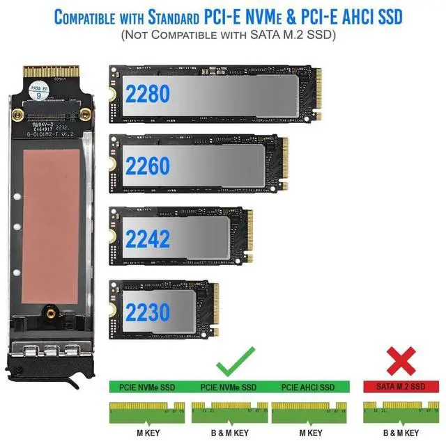 SSD support: M Key in 2230/2242/2260/2280. Tool-less installation or built-in screw installation. Secure with triangle keylock. 1 x 7010 cooling fan (2800 rpm). PCB optimized layout for PCIe 4.0. 2 x Mini 4-pin power connector. 2 x SlimSAS connector. 159mm (L) x 101.2 mm (W) x 25.4 mm (H).