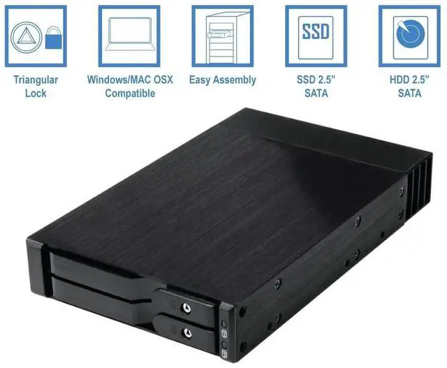 Upgrade your storage solutions with the Kingwin Dual 2.5 HDD/SSD Mobile Rack, designed for professionals and enthusiasts who demand performance, security, and convenience. Built with a sleek aluminum construction, this mobile rack supports two 2.5 SATA or SAS drives, delivering blazing-fast data transfer speeds of up to 6Gbps (SATA) and 12Gbps (SAS). The trayless, tool-free design makes swapping drives effortlessno screws, no trays, and no hassle. Whether youre performing backups, managing data centers, or upgrading your system, this feature allows for quick installations and efficient maintenance.