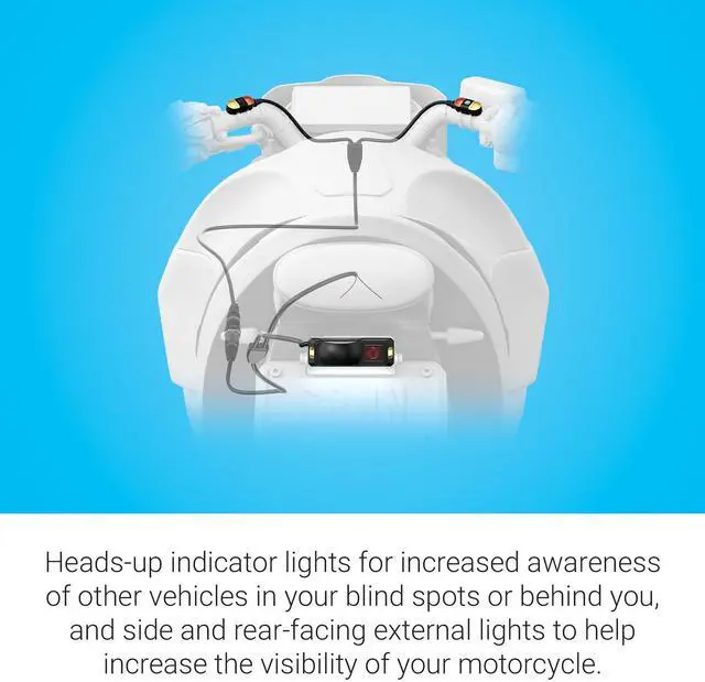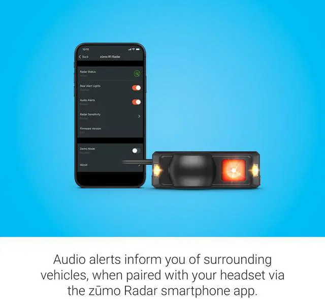 Ride and see with zumo R1 Radar. This discreetly sized rearview and blind spot motorcycle radar with external lights offers excellent coverage, range and accuracy. The heads-up indicator lights promote situational awareness while the side-facing amber lights and high-visibility red rear-facing lights help you be seen by other vehicles to help foster a safer riding environment. View a full-screen radar display of nearby vehicles when you pair zumo R1 Radar with your zumo XT2 motorcycle navigator or your compatible smartphone via the zumo Radar smartphone app. You can also hear audio alerts to help increase your road awareness while your eyes remain on the road, when paired with your headset via the app.