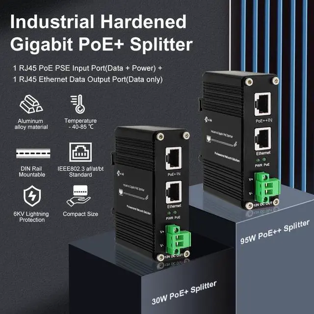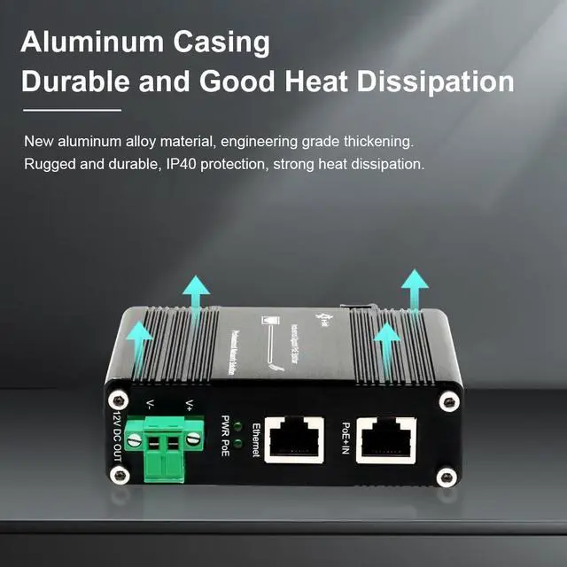 E-link Industrial Hardened Gigabit PoE+ Splitter PoE IEEE802.3 at 30W Input 20W/12VDC Output DIN- Rail Wall Mount -40degC to 80degC IP40