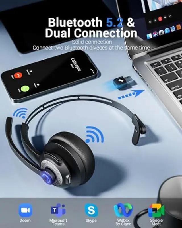JIAMQISHI Wireless Headset with Microphone Bluetooth Headphones - Bluetooth V5.2 Headphones with USB Dongle & Mic Mute for PC/Computer/Laptop/Call Center/Zoom/Online Class/Trucker - Bluetooth Headset