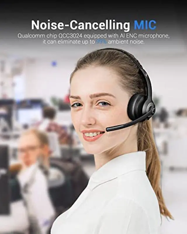 [(Noise Reduction Microphone)] EH06 computer wireless headset with microphone Qualcomm chip QCC3024 is equipped with AI environment noise reduction microphone, which can automatically identify the surrounding noise and perform noise reduction processing, so as to provide a clearer call experience, suitable for truck drivers, field services, retail, and warehouse workers etc. calling professions. No matter where you are, you can be heard clearly.