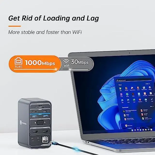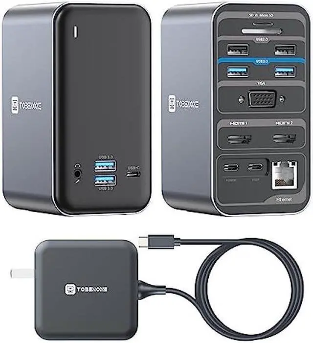 15 IN 1 USB C Docking Station Dual Monitor: Featuring an impressive 15 ports, the TOBENONE USB-C docking station dual monitor has enough connectivity for even the most demanding of workflows. This includes 2 HDMI, VGA, 4xUSB 3.0 and 1xUSB C data transfer ports(5Gpbs), 2xUSB 2.0 for wireless devices such as keyboard or mouse, 1 USB C PD 3.0, 3.5mm Audio in & out, SD/TF card reader and RJ45 Gigabit Ethernet, all through a single USB C cable back to your Windows laptop, plug and play.