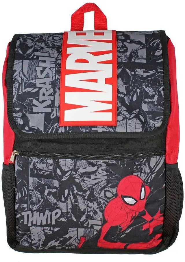 LARGE 3D MOLDED MARVEL LOGO AND SPIDEY DESIGN - This Spider-Man backpack features a large, raised 3D Marvel logo on the main compartment flap. It has a detailed Spiderman comic pattern with a large character on the bottom corner