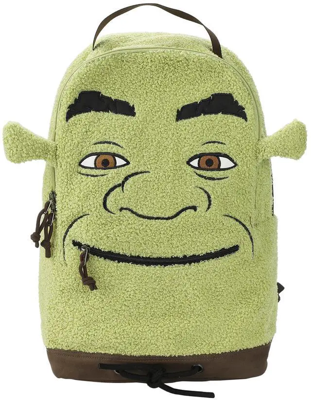 Embrace your inner ogre with this green Shrek backpack, designed to look like the lovable character. Featuring 3D ears and a zipper that doubles as Shrek's mouth, this unique bag is perfect for fans. It includes a peek-a-boo front pocket for extra storage, an interior laptop sleeve for added functionality, and is made with faux sherpa and poly for durability. Measuring 12" W x 17.5" H x 6" D, it's easy to wipe clean to keep it looking fresh.