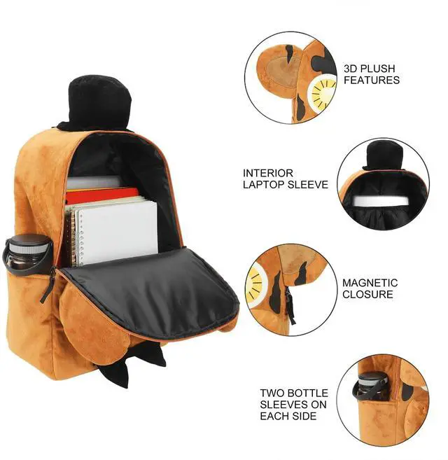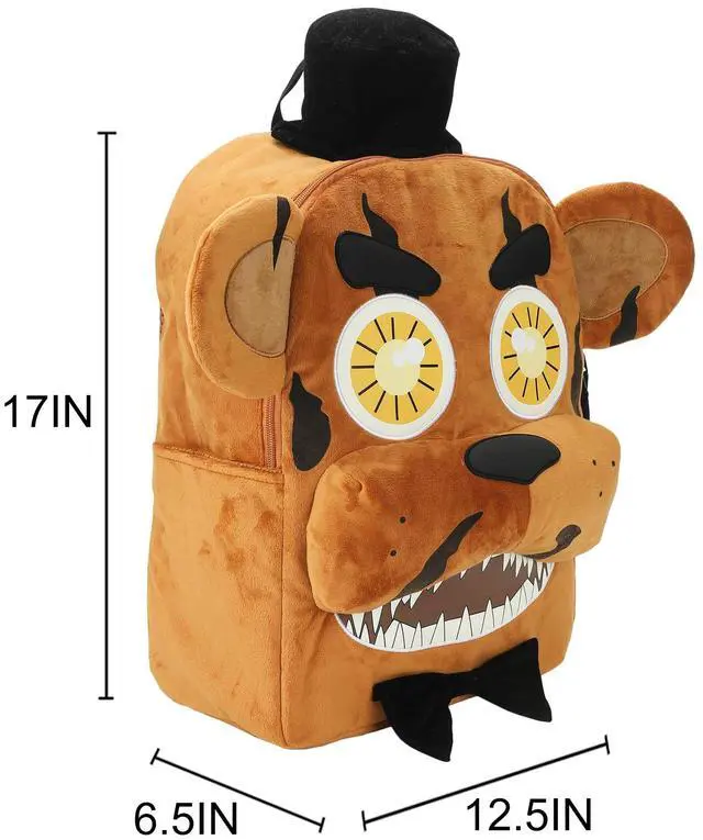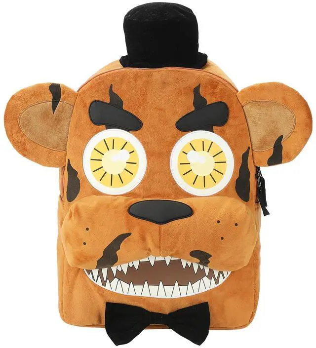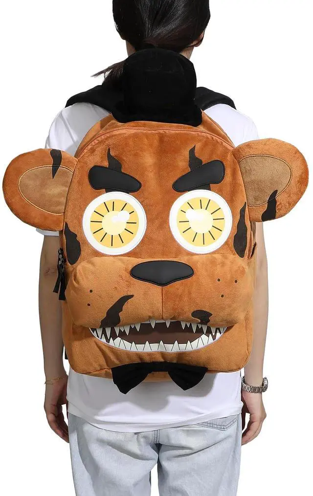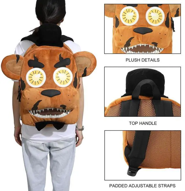 DescriptionStep into the world of Five Nights at Freddy's with this novelty backpack shaped like Freddy's head, featuring 3D plush details for an authentic look. Perfect for fans, this bag offers adjustable shoulder straps for a comfortable fit and an interior laptop sleeve for added functionality. Made with soft poly fur, it's both fun and practical. For easy care, wipe it clean to keep it looking fresh.