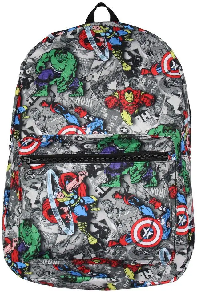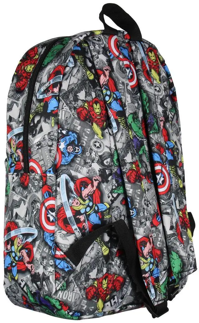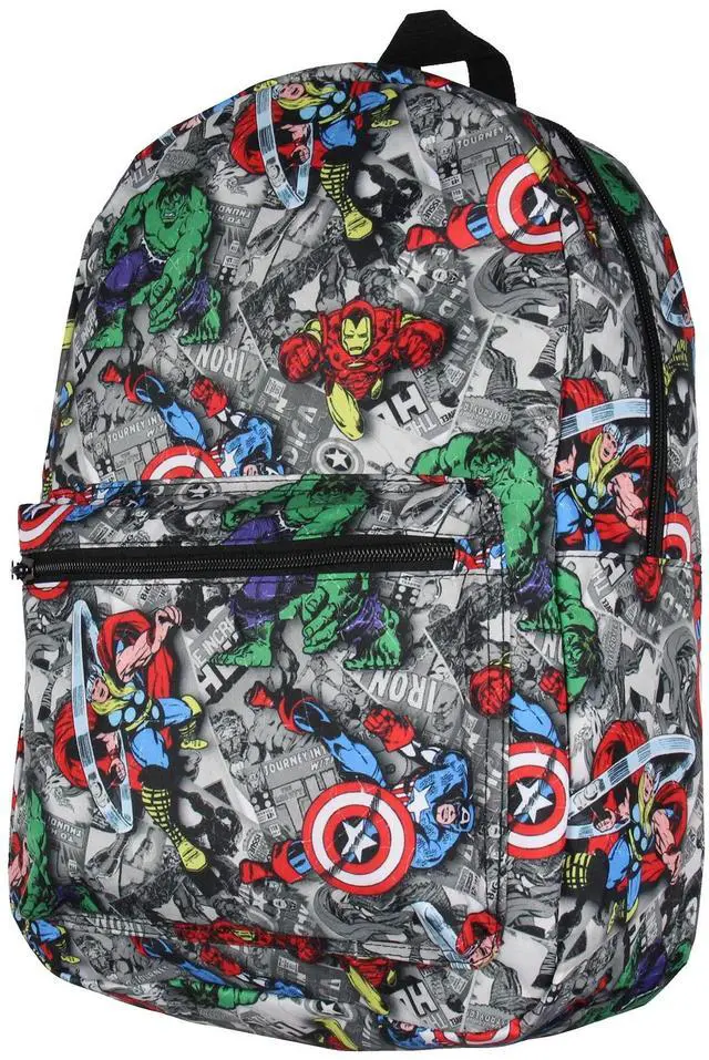 MARVEL MERCHANDISE - This Avengers Backpack is a guaranteed product manufactured by one of the world's largest pop funure retail designers, Bioworld. ^^ ALLOVER PATTERN - It features a wonderful allover pattern of 4 superheroes from the Avengers, Captain America, Thor, Hulk, And Iron Man, along with vintage comics. ^^ OUTER FEATURES - The backpack has 1 outer zipper closure pocket that is great for utensils like pens, pencils calculators and more. Easy-carry top handle and adjustable padded shoulder straps ^^ MAIN COMPARTMENT - The main compartment features a padded laptop pocket and a padded back great for storing valuable electronics like tablets, phones, and personal laptop computers.