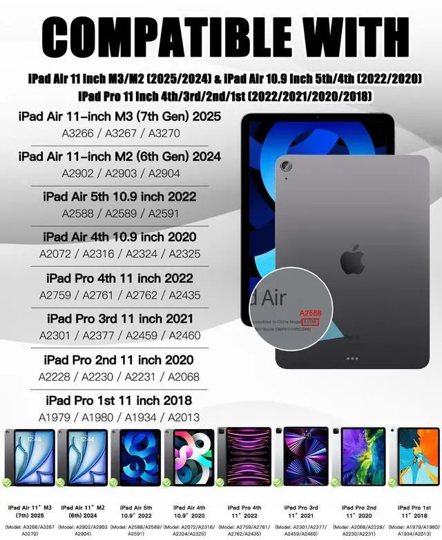 Compatibility: Compatible with Apple iPad Air 11-inch M3 (2025 - Model:A3266/ A3267/ A3270), iPad Air 11-inch M2 (2024 - Model: A2902/ A2903/ A2904); iPad Air 5th 10.9" 2022 (A2588/ A2589/ A2591); iPad Air 4th 10.9" 2020 ( A2072/ A2316/ A2324/ A2325); iPad Pro 11 inch 4th Gen 2022 (A2759/ A2435/ A2761/ A2762); iPad Pro 11 inch 3rd Gen 2021 (A2301/ A2377/ A2459/ A2460); iPad Pro 11 inch 2nd Gen 2020 (A2228/ A2068/ A2230/ A2231); iPad Pro 11 inch 1st Gen 2018 (A1980/ A2013/ A1934/ A1979). NOT compatible with any other model device, Please check your model or Ask Rfuns before purchasing