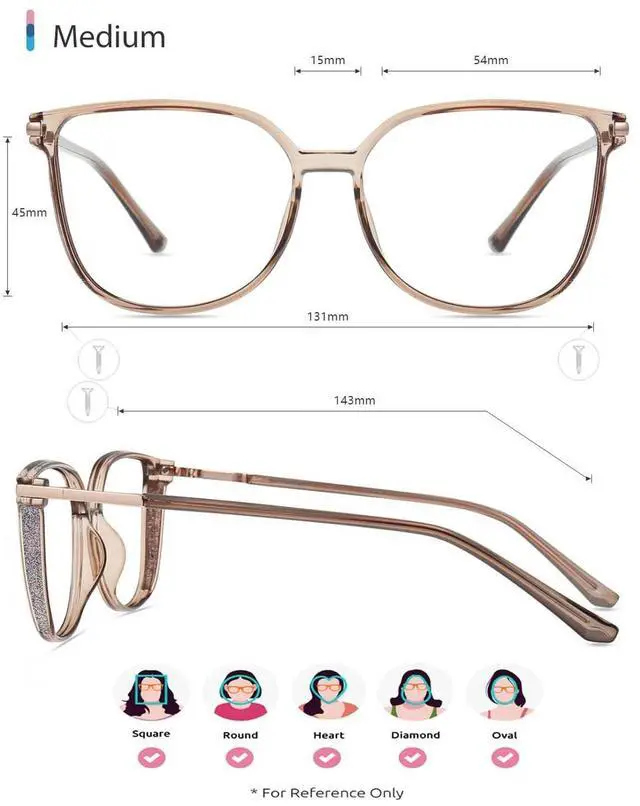 PRODUCT DIMENSIONS - Medium Glasses: Weight:14g, Frame Width: 54mm(2.13in), Frame Height: 45mm(1.77in), Temple Length: 143mm(5.63in), Nose Bridge: 15mm(0.59in)