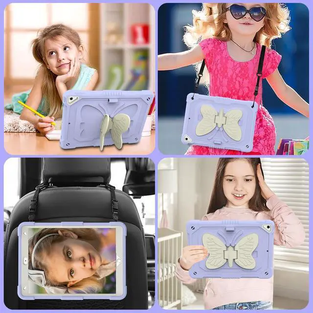 HOGENL for iPad 9th 8th 7th Generation Case for Kids Girls with Pencil Holder, for iPad 10.2 Case with Butterfly Stand Shoulder Strap Shockproof Full Body Protective Cover for iPad Air 3rd Gen, Purple