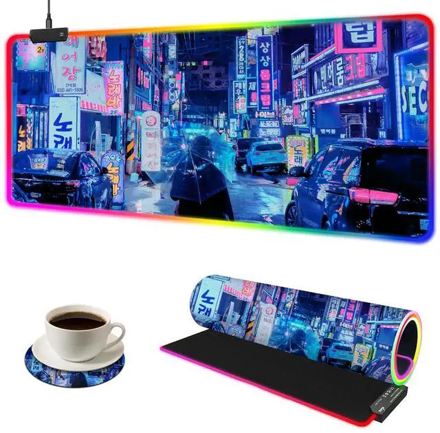 YQE RGB Gaming Mouse Pad, 35.4"x15.7" Desk Mat for Keyboard and Mouse, LED Game Mousepad with 14 Colors Modes, Non-Slip Desk Pad Matt Protector+Coasters-for Home, Office, Desktop, Blue Neon Sign