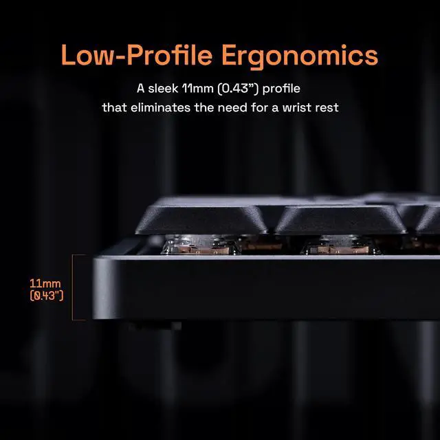 Ergonomic Low Profile Comfort Magi75 wireless mechanical keyboard features an optimized 75% form factor for a clean, efficient workspace. Ultra-slim switches and low-profile keycaps keep wrists aligned and reduce fatigue, with a sleek 11mm (0.43") front profile that eliminates the need for a wrist restperfect for long work sessions, gaming marathons, or clean minimalist setups.