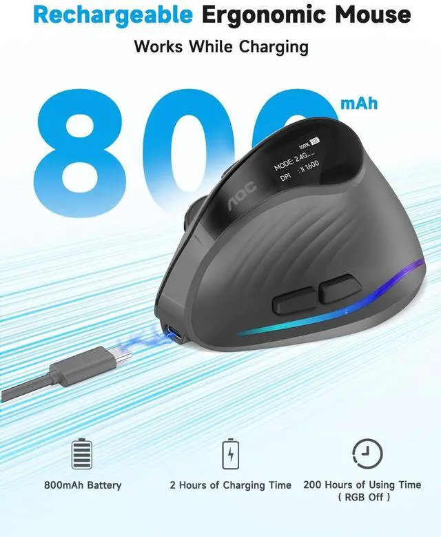 Battery Life: An 800mAh rechargeable cell powers this ergonomic mouse for up to 200 hours without RGB and 40+ hours with RGB active. The Type-C charging supports use-while-charging, keeping the ergonomic mouse powered and ready anytime. The built-in LED status screen shows battery percentage at a glance to avoid unexpected downtime ^^