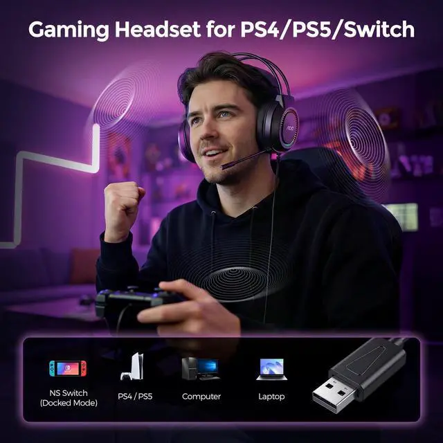 Mic: The sensitivity (-56dB) microphone ensures your voice is transmitted with exceptional clarity. Its omnidirectional pickup is perfect for in-game coordination, Zoom calls, and chatting with friends. You can switch on/off the microphone by using the microphone switch ^^ RGB Lighting Headset with