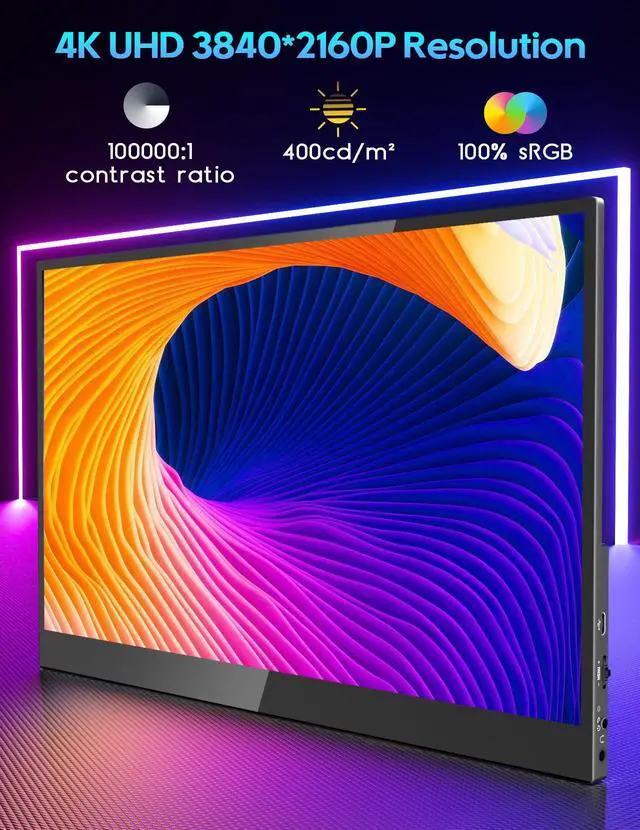 15.6"4K Portable MonitorHONGO 15.6" external portable monitor uses OLED display technology(can show the effect of pure black), 100% DCI-P3, top-tier contrast(100000:1), limitless range of colors (1.06 billion), and the screen is 4K(3840*2160P) ultra-high-definition resolution, all of this can provide you richer colors and more realistic picture quality in high-brightness images. Note: The touch function is only supported when using USB-C full-featured cable.