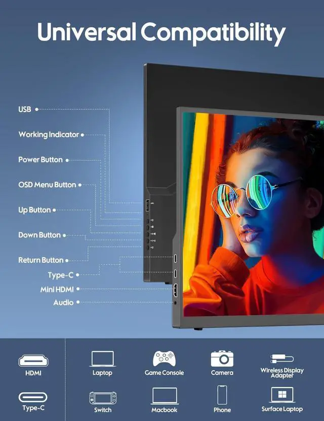^^ Wide Compatibilities: This portable computer monitor is equipped with a HDMI port, 2 USB C 3.1 ports and 1 USB-A port, making it compatible with a variety of devices including laptops, PC, Phone, Xbox, PS4, and Switch. Raspberry Pi, PS3, Wii, Steam Deck Whether you need to increase your productivity at work or enhance your gaming experience, this monitor is an excellent choice. ^^