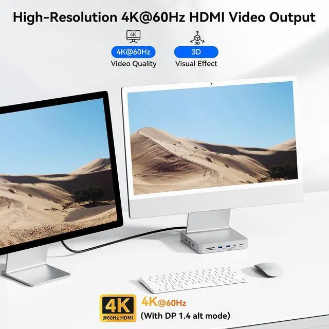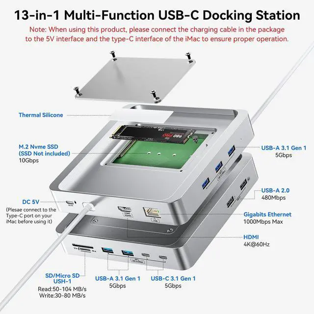 13-in-1 Multifunctional Extension: AGEEN 13-in-1 iMac USB Hub expands your 2021/2023/2024 24 inch iMac ability with 5*USB-A 3.0 ports, 2*USB-C 3.0 ports, 2*USB-A 2.0 ports, 4K@60Hz HDMI port, RJ45 Gigabit Ethernet port, SD/TF card slot, DC 5V port, M.2 NVME SSD enclosure. Plug and play, no software, drivers, or complicated installation required. It's an ideal tool to enhance your iMac experience. Note: Connect the Hub to one of your iMac's Thunderbolt ports.