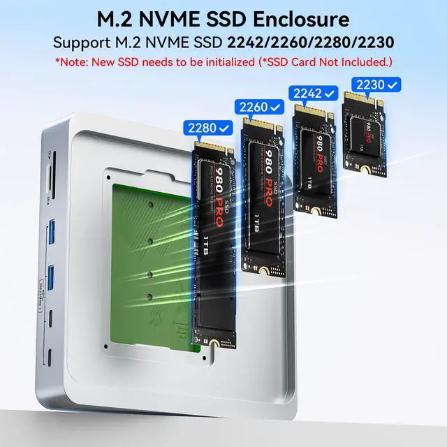 Built-in M.2 NVME SSD Enclosure: With support for max 8TB SSD, this imac accessories is a perfect storage solution. Whether for expanding iMac storage or backing up important files, it offers an ultra-fast external drive option that ensures smooth workflow for data-intensive tasks. It supports 2230/ 2242/ 2260/ 2280 M.2 SSD. Note: New SSD needs to be initialized. SSD Card Not Included. It does not support SSD cards in NGFF & SATA format.